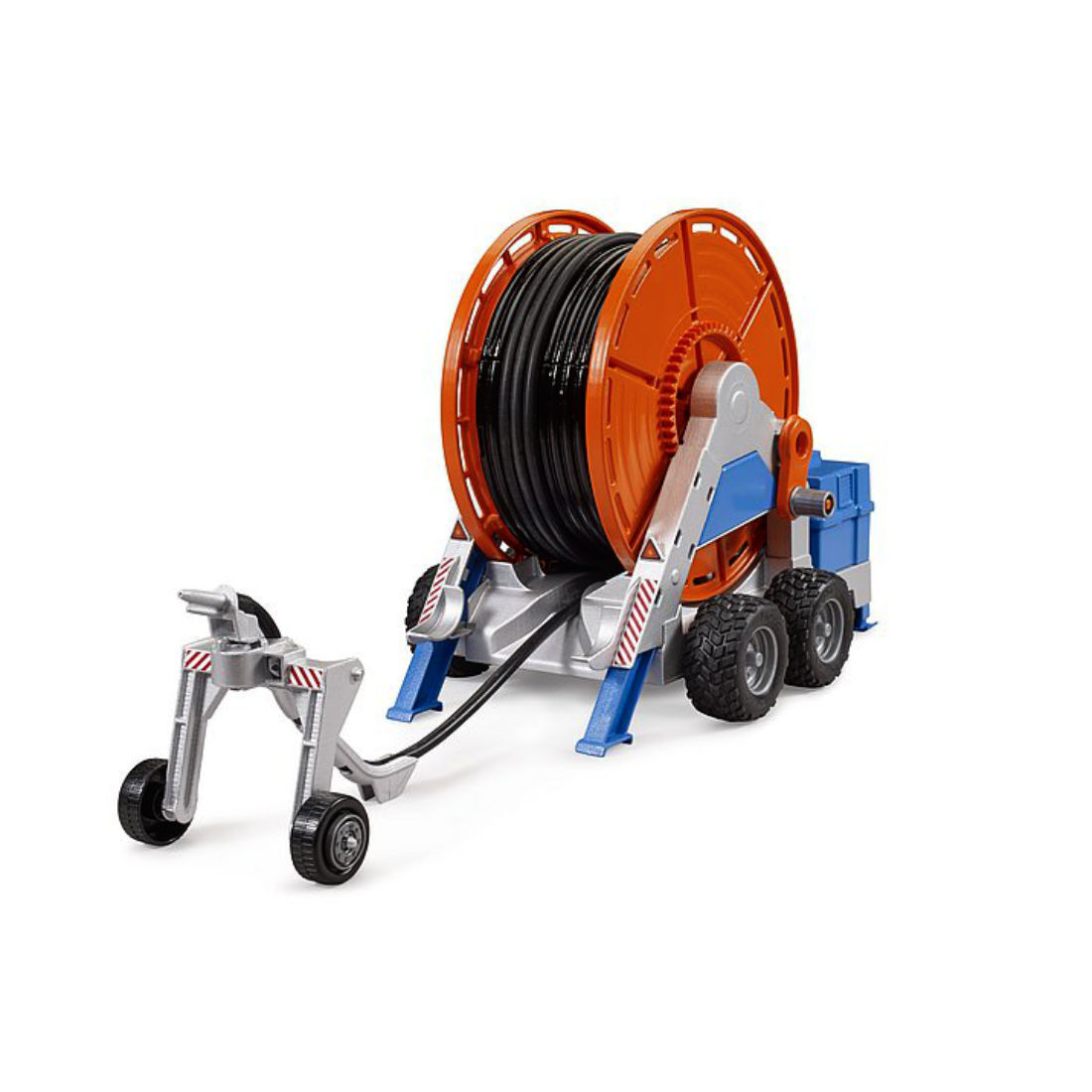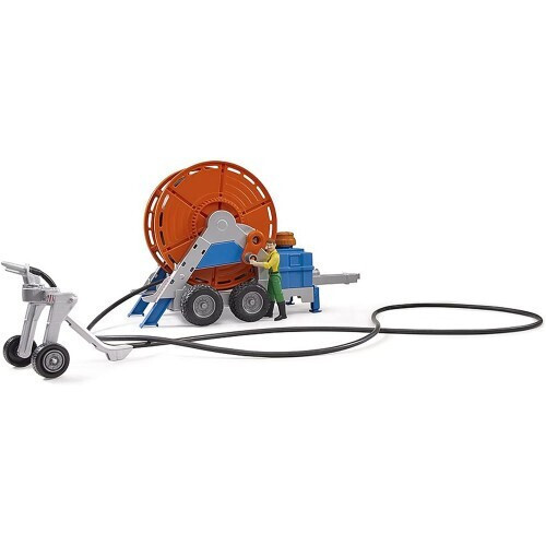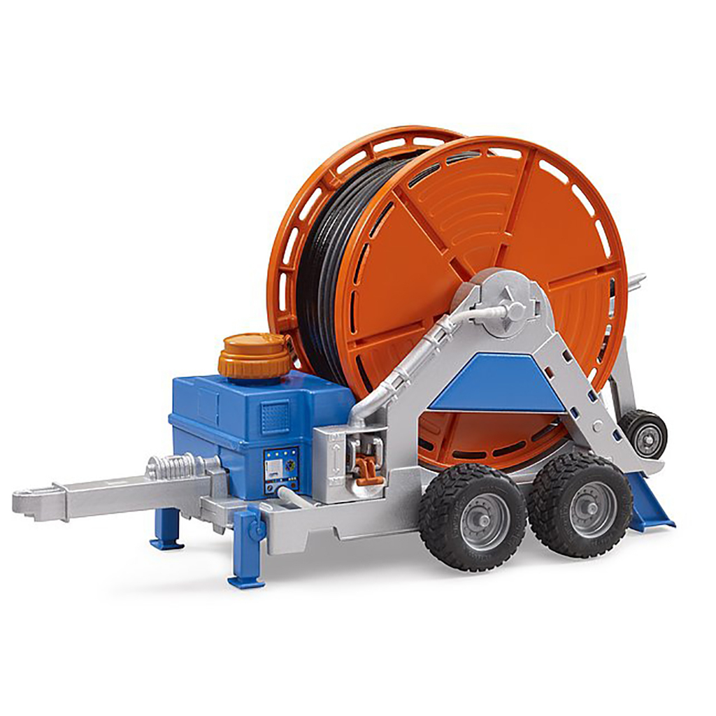 Τρέιλερ με καρούλι ποτίσματος από την εταιρεία Bruder. Οι νέοι μικροί αγρότες μπορούν να χρησιμοποιήσουν τη μανιβέλα για να ξετυλίξουν έναν εύκαμπτο σωλήνα μήκους 1,8 μέτρων, στον οποίο είναι προσαρτημένο ένα φορτηγό καταιονισμού με ακρίβεια λεπτομερειών. Διαθέτει μια δεξαμενή με λειτουργική αντλία. Το σύστημα αντλίας επιτρέπει την εύκολη και ρεαλιστική διανομή του νερού. Αυτό το συναρπαστικό τρέιλερ άρδευσης μπορεί να ρυμουλκηθεί από όλα τα τρακτέρ BRUDER από τον κόσμο με θέμα τη γεωργία.