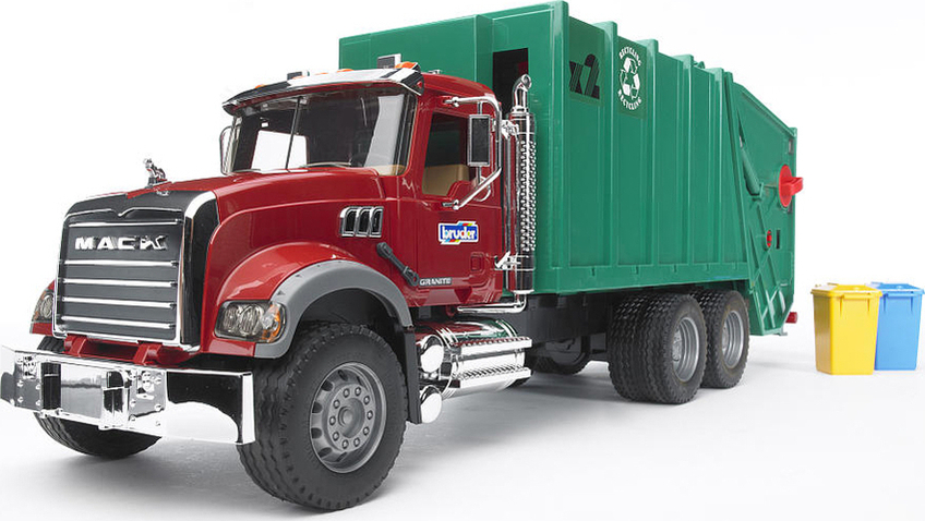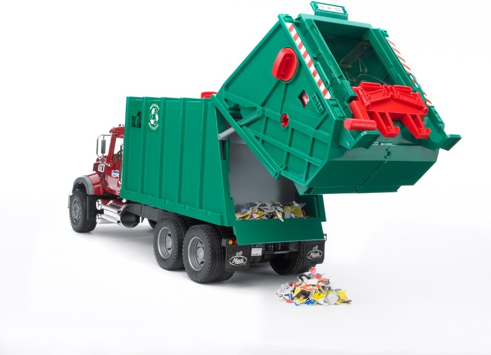 Η απίστευτα ρεαλιστική καμπίνα του οδηγού με τις πόρτες που μπορούν να ανοίξουν, το κεκλιμένο καπό κινητήρα, παρέχοντας θέα στο μπλοκ του κινητήρα, τους αναδιπλούμενους καθρέφτες και τα πολλά πρόσθετα αξεσουάρ, που δίνουν στο μοντέλο τη χρωματική του εμφάνιση. αυτό το φορτηγό είναι μια πραγματική γιορτή για τα μάτια κάθε ανεμιστήρα φορτηγού. Όταν χρησιμοποιείται ως απορριμματοφόρο, αυτό το φορτηγό καταφέρνει να συναρπάσει τα παιδιά με την ανακύκλωση και τη διαχείριση απορριμμάτων. Οι μικροί κάδοι σκουπιδοτενεκέ (περιλαμβάνονται) ή οι γκρι κάδοι απορριμμάτων (δεν περιλαμβάνονται) μπορούν να αδειάσουν χρησιμοποιώντας έναν πλήρως λειτουργικό ανυψωτήρα απορριμμάτων. Μπορούν να ανοίξουν τόσο τα χρωματιστά κάδο απορριμμάτων όσο και το δοχείο απορριμμάτων. Όπως και στην πραγματική ζωή, ένας πρέσα εργασίας μεταφέρει τα σκουπίδια στο εσωτερικό δοχείο φόρτωσης, το οποίο μπορεί να αδειάσει γέρνοντας την πίσω πόρτα. η πίσω πόρτα θα κλειδώσει στη θέση της όταν ανοίξει.