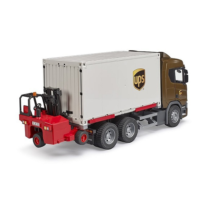 Φορτηγό Scania Super 560R από τη Bruder. Είναι πιστό αντίγραφο του πραγματικού σε κλίμακα 1:16. Διαθέτει τριπλούς άξονες, πλατφόρμα κοντέινερ και ένα φορητό περονοφόρο ανυψωτικό. Το κοντέινερ είναι αποσπώμενο και περιλαμβάνει πτυσσόμενες πόρτες στο πίσω μέρος, για περισσότερες επιλογές παιχνιδιού. Ένα μοναδικό χαρακτηριστικό είναι η πλατφόρμα φόρτωσης, η οποία αποσπάται αυτόματα από το όχημα, ανεβάζοντας το κοντέινερ, ώστε το φορτηγό να μπορεί να βγει από κάτω της. Το νέο πιλοτήριο αποπνέει το δυναμικό σχεδιασμό της σειράς Scania R, ενώ διαθέτει ανοιγόμενες πόρτες, αναδιπλούμενους εξωτερικούς καθρέφτες και διάφανα, άθραυστα τζάμια από υψηλής ποιότητας πολυανθρακικό.