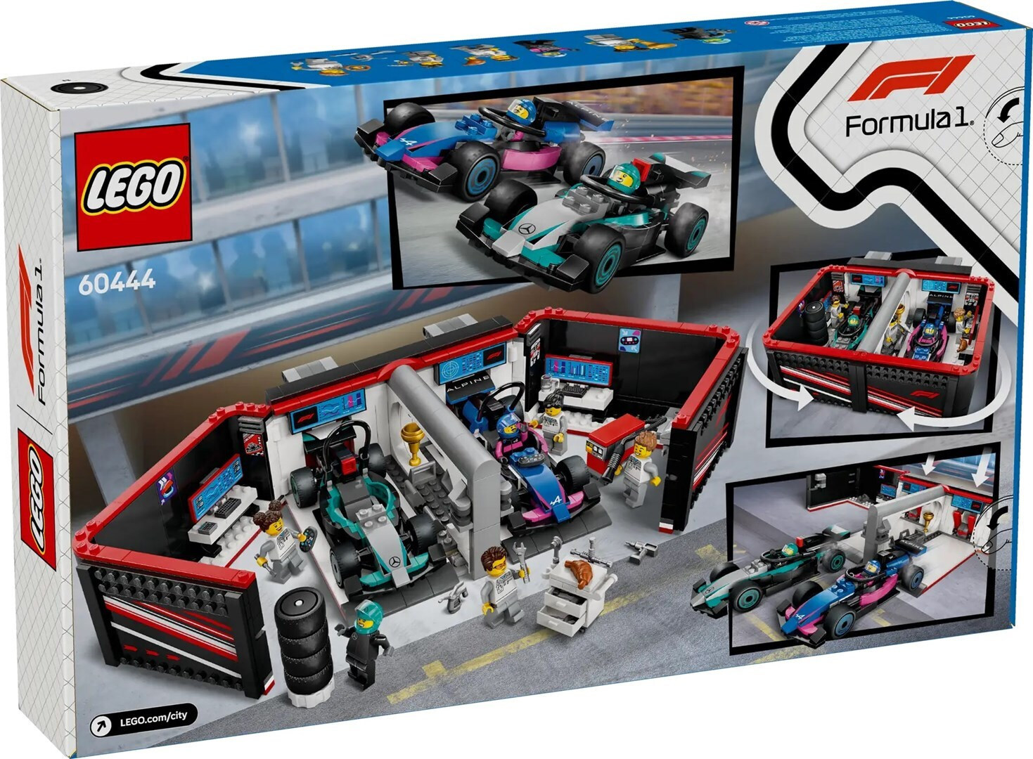 LEGO® City 60444 F1® Garage με αυτοκίνητα Mercedes-AMG & Alpine. Ιδανικό για τους λάτρεις των αγώνων και της κατασκευής, προσφέρει την εμπειρία της δημιουργίας ενός γκαράζ F1.