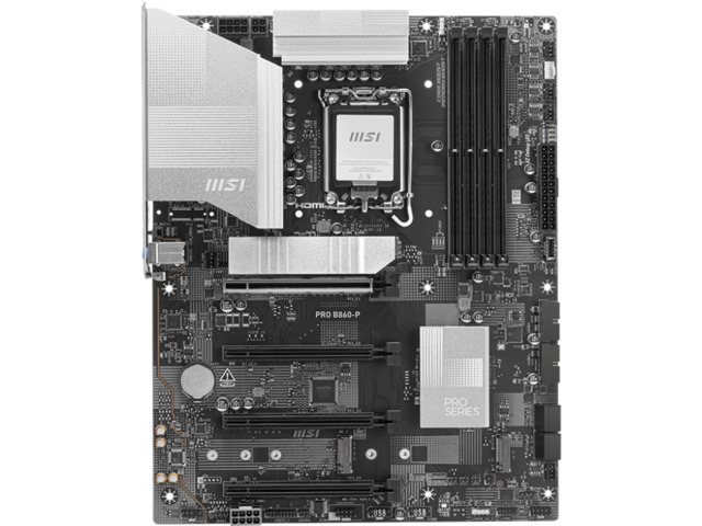 Η  MSI Pro B860-P προσφέρει έναν απλό σχεδιασμό με αρμονικό ασημί χρωματικό σχέδιο που ταιριάζει άψογα με PC Builds σε λευκό ή μαύρο χρώμα. Είναι σχεδιασμένη με πολλές αποκλειστικές δυνατότητες της MSI, όπως 5G LAN, Thunderbolt 4, PCIe 5.0 M.2 και Supplemental PCIe Power, έτοιμη να υποστηρίξει τους επεξεργαστές Intel Core Ultra (Series 2).