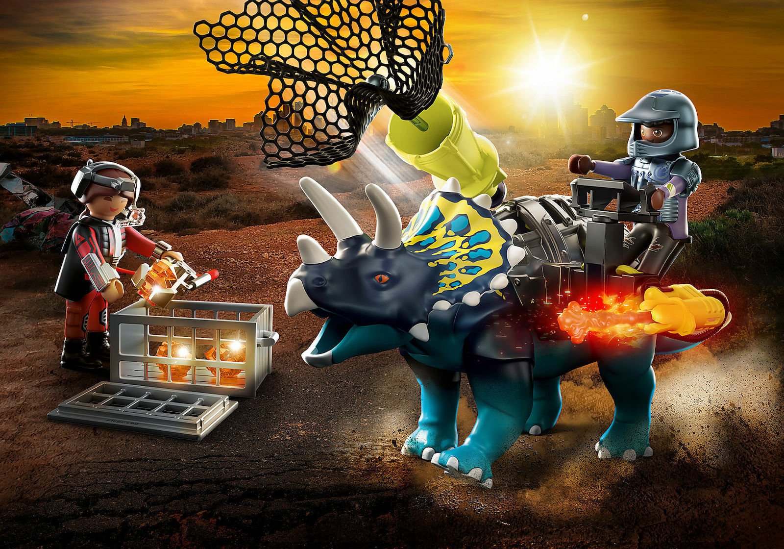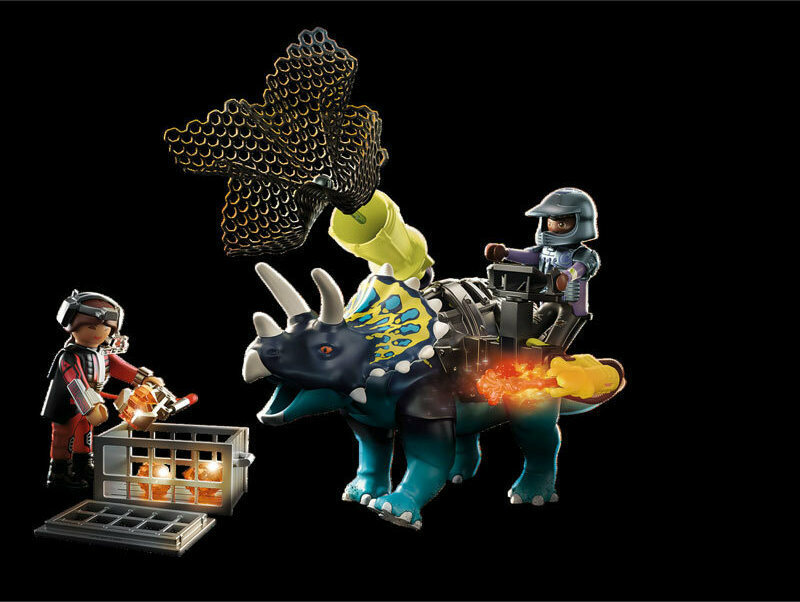 Ο Τρικεράτωψ είναι εξοπλισμένος με ένα δίχτυ και μία πανίσχυρη πανοπλία που αφαιρείται. Η φιγούρα μπορεί να καθήσει πάνω στον δεινόσαυρο. Κατάλληλο για παιδιά 5-10 ετών Περιέχει 40 κομμάτια