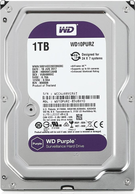 Η σειρά δίσκων WD Purple είναι σχεδιασμένη για συστήματα παρακολούθησης με διεπαφή SATA III. Είναι ειδικά κατασκευασμένοι για συστήματα ασφαλείας υψηλής ευκρίνειας μέσα σε ένα NVR περιβάλλον, με υποστηριζόμενο φόρτο εργασίας έως και 180 TB/έτος και παρέχοντας υποστήριξη για έως και 64 κάμερες.